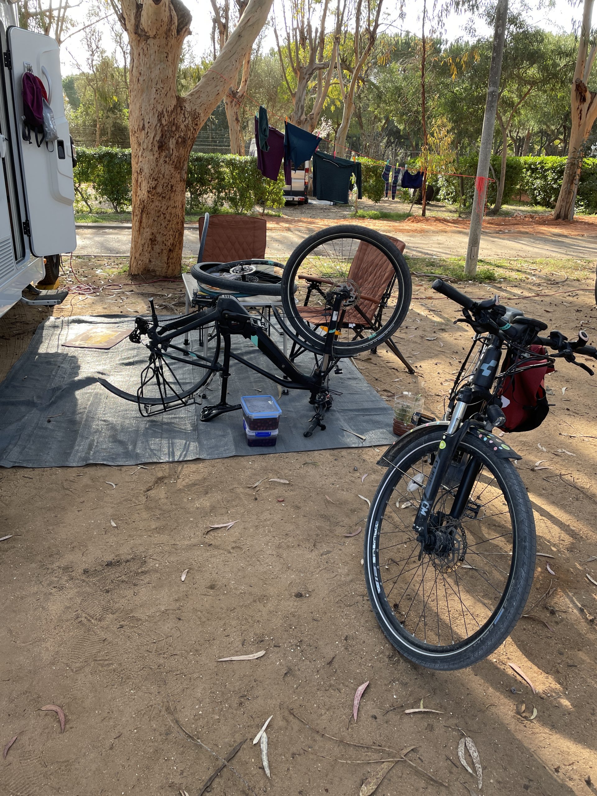 Dann ging es weiter nach Alvor. Mein Fahrrad hatte einen Platten (soviel zu „unplattbarer Mantel“) Ich hatte natürlich das Reparaturwerkzeug und Flickzeug fürs Fahrrad komplett vergessen. In Alvor soll es aber 3 Fahrradvermietungen/Läden geben, also stellen wir unser Wohnmobil auf einem schönen Campingplatz ab und machen uns zu Fuß auf den Weg durchs Ministädtchen an den Strand. Alle 3 Läden zu! Und „Karstadt“ oder sowas gibts hier nicht. Aber dafür Decathlon 7 Kilometer entfernt. Latschen wir also nach einem schönen Strandtag wieder zurück, schwing mich auf Heides Rad und mach mich auf den Weg zu Decathlon. Bei Decathlon stelle ich dann fest, dass ich gar kein Geld eingesteckt hatte. Also wieder zurück und nochmal los. Mein Fitnessprogramm war dann für den Tag mal erreicht, geflickt wird erst am nächsten Tag.