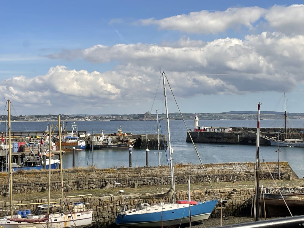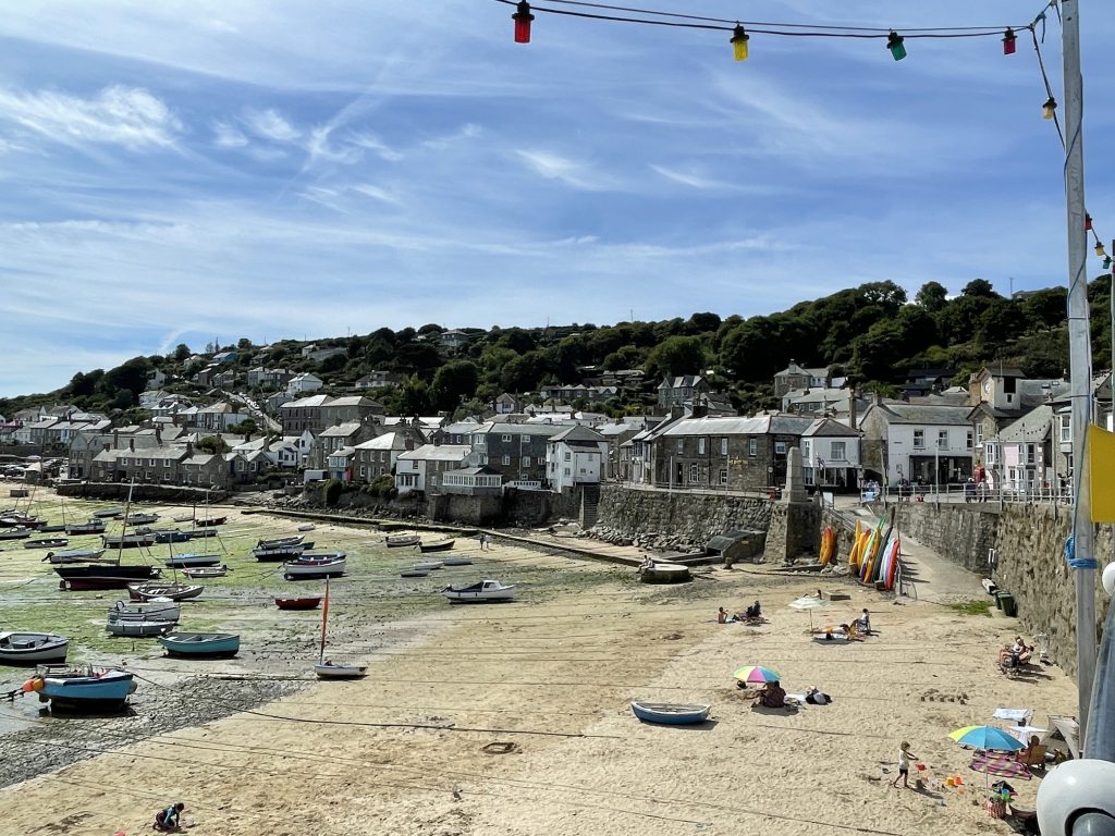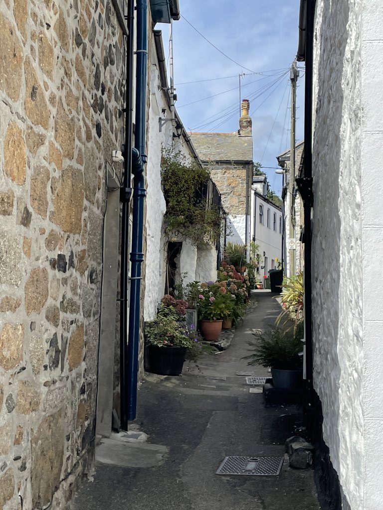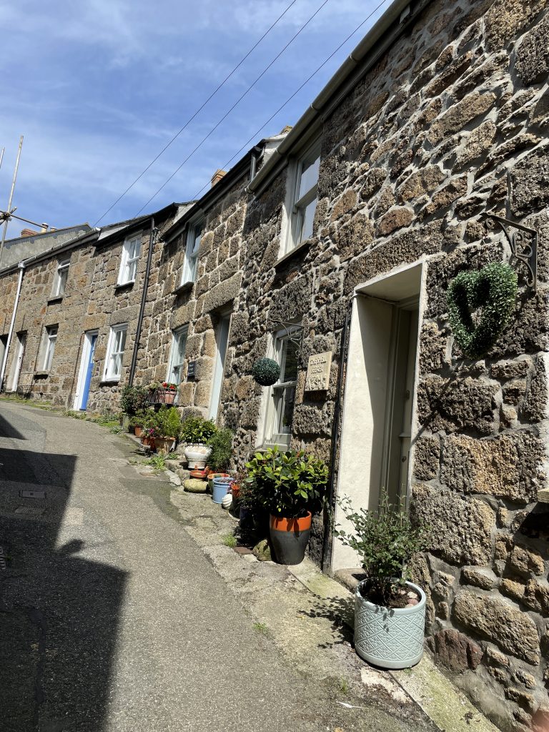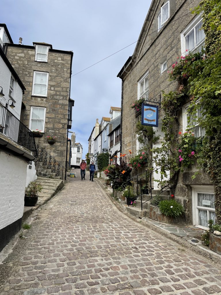 Am nächsten Tag wollen wir nach Penzance fahren. Wir nehmen wieder den Bus. Penzance liegt auch am Wasser, ist aber ganz anders als St. Ives. Man hat das Gefühl, die Stadt hatte schon mal eine bessere Zeit gesehen. Eigentlich besteht Penzance nur aus “1 Euro” und Second Hand Läden. Hier gibt es auch Ladenleerstand und einige Ecken, in denen ich froh bin, Petra dabei zu haben. Also fahren wir kurzentschlossen ein bisschen weiter nach Mousehole, ein kleines Örtchen an der Küste. Das war eine gute Idee. Hier gibt es kleine nette Geschäfte und Galerien, in denen man den Künstlern bei der Arbeit zusehen kann. Am winzigen Hafen essen wir eine Kugel Eis und schauen den Menschen und vor allen den Möwen bei ihrer Futtersuche zu. Unglaublich! Eine Möwe umrundet zu Fuß einen verlassenen Platz mit einer Decke und Strandstühlen. An einem Stuhl hängt eine Tasche. Das ist ihr Ziel! Sie macht sich daran zu schaffen und zieht eine Papiertüte heraus. Es macht einige Arbeit, aber dann hat sie die Tüte auf. Nun kommen ihre Kollegen neugierig dazu. Aber unsere Möwe lässt sie nicht näher kommen, denn sie hat einen dicken Pastie ausgewickelt und fliegt, mit dem schweren Teil im Schnabel, vorn übergekippt, davon. Das war ein lustiges Schauspiel, vor allem weil kurze Zeit später ein ziemlich stabiler Mann aus dem Wasser kam und ziemlich verdutzt auf die leere Papiertüte schaute. Sofort kontrollierte er seine Strandtasche, aber Glück gehabt, außer dem Essen fehlte nichts.