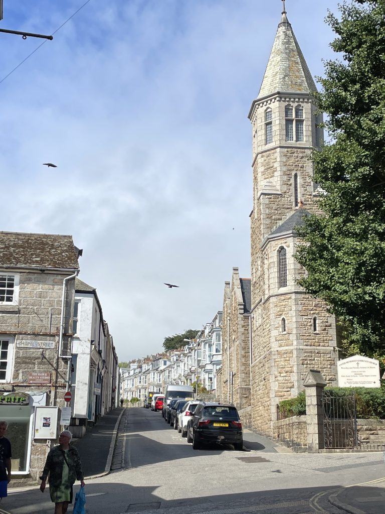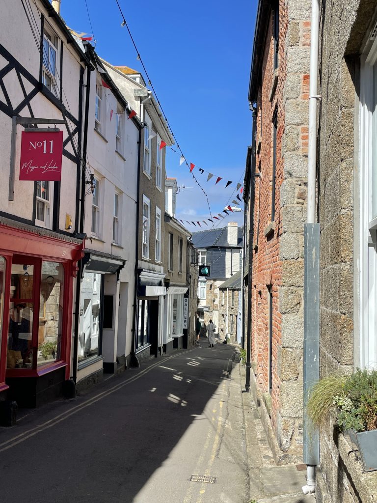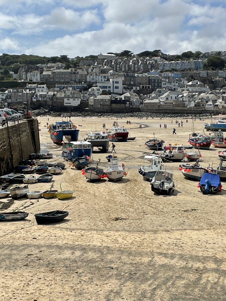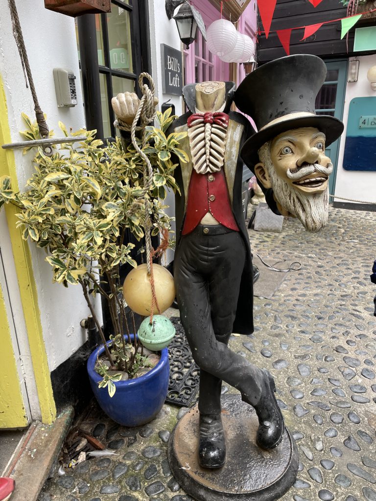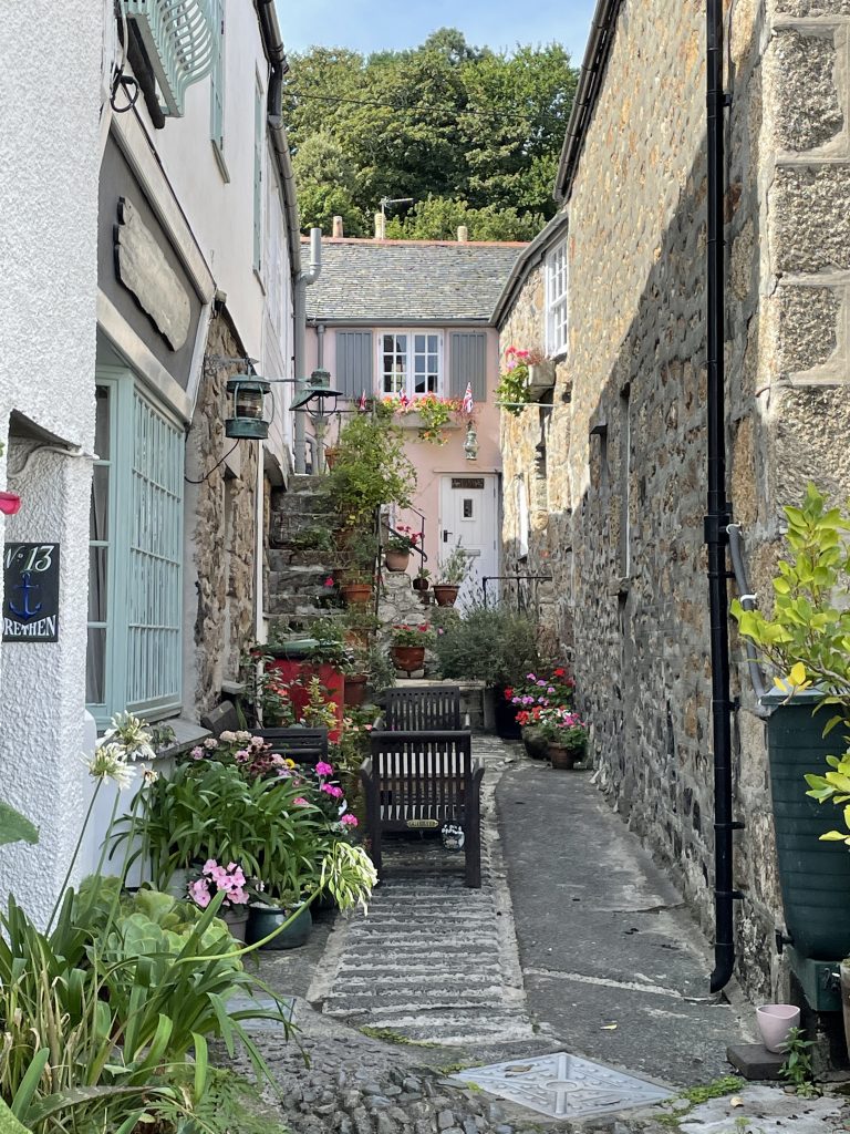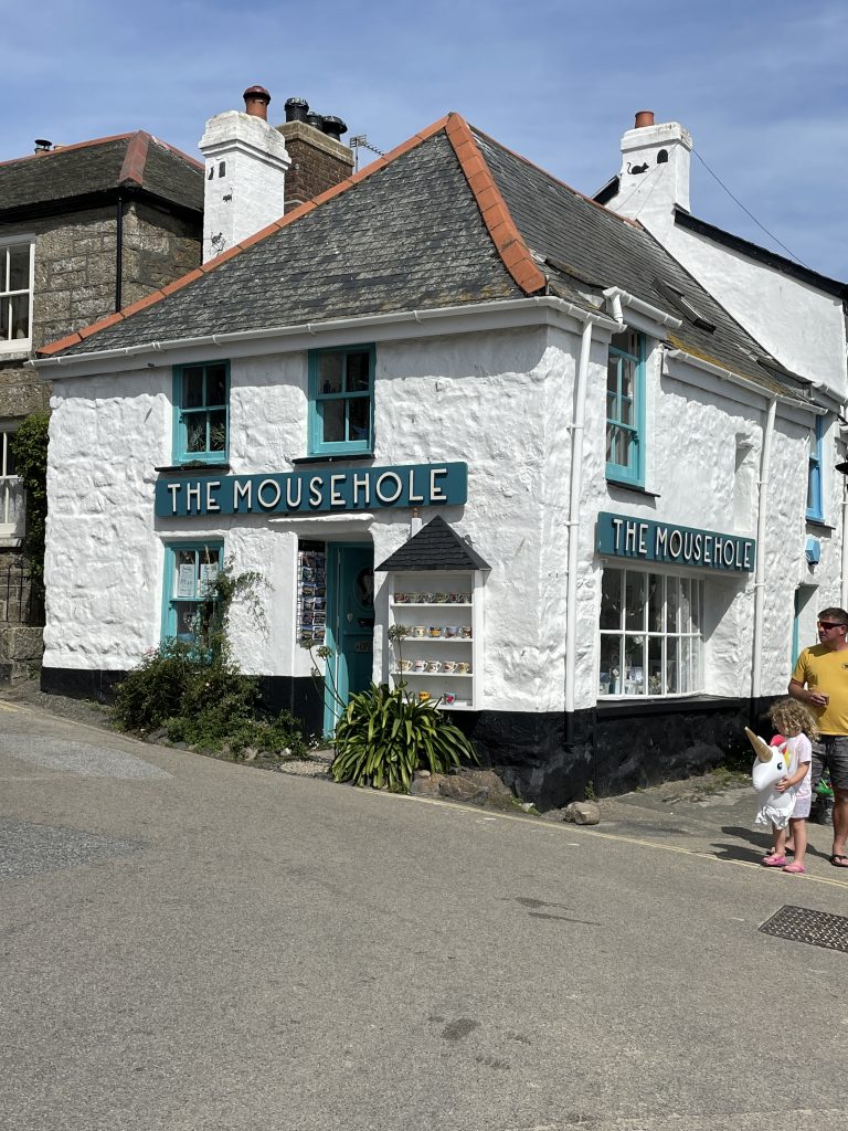 Am nächsten Tag wollen wir nach Penzance fahren. Wir nehmen wieder den Bus. Penzance liegt auch am Wasser, ist aber ganz anders als St. Ives. Man hat das Gefühl, die Stadt hatte schon mal eine bessere Zeit gesehen. Eigentlich besteht Penzance nur aus “1 Euro” und Second Hand Läden. Hier gibt es auch Ladenleerstand und einige Ecken, in denen ich froh bin, Petra dabei zu haben. Also fahren wir kurzentschlossen ein bisschen weiter nach Mousehole, ein kleines Örtchen an der Küste. Das war eine gute Idee. Hier gibt es kleine nette Geschäfte und Galerien, in denen man den Künstlern bei der Arbeit zusehen kann. Am winzigen Hafen essen wir eine Kugel Eis und schauen den Menschen und vor allen den Möwen bei ihrer Futtersuche zu. Unglaublich! Eine Möwe umrundet zu Fuß einen verlassenen Platz mit einer Decke und Strandstühlen. An einem Stuhl hängt eine Tasche. Das ist ihr Ziel! Sie macht sich daran zu schaffen und zieht eine Papiertüte heraus. Es macht einige Arbeit, aber dann hat sie die Tüte auf. Nun kommen ihre Kollegen neugierig dazu. Aber unsere Möwe lässt sie nicht näher kommen, denn sie hat einen dicken Pastie ausgewickelt und fliegt, mit dem schweren Teil im Schnabel, vorn übergekippt, davon. Das war ein lustiges Schauspiel, vor allem weil kurze Zeit später ein ziemlich stabiler Mann aus dem Wasser kam und ziemlich verdutzt auf die leere Papiertüte schaute. Sofort kontrollierte er seine Strandtasche, aber Glück gehabt, außer dem Essen fehlte nichts.