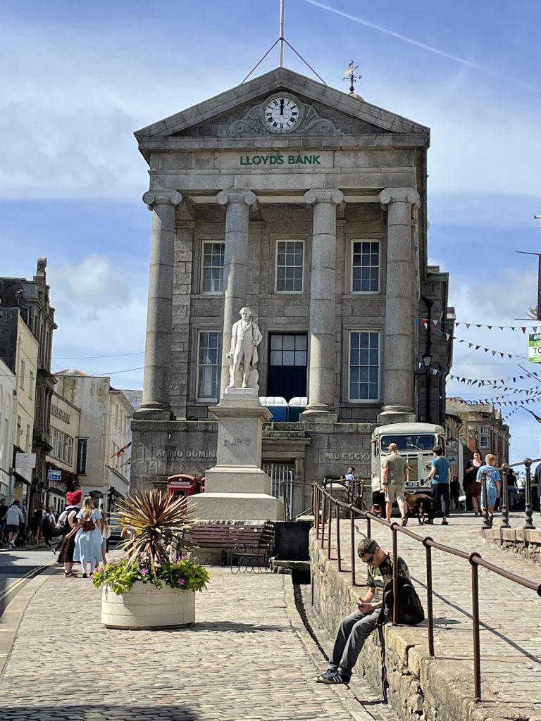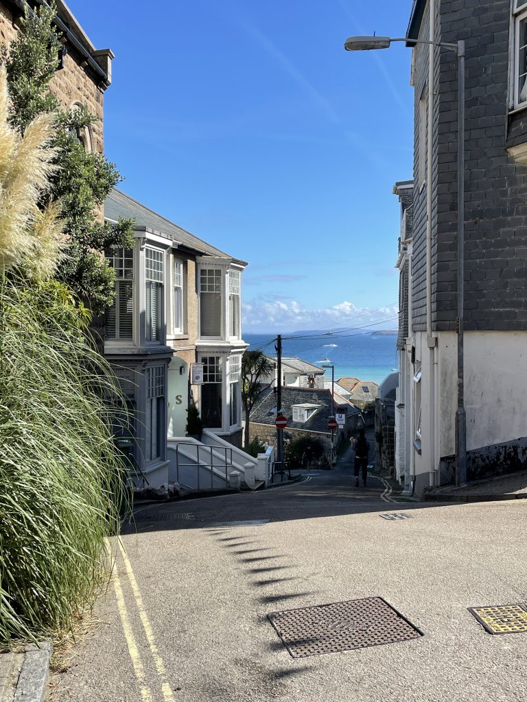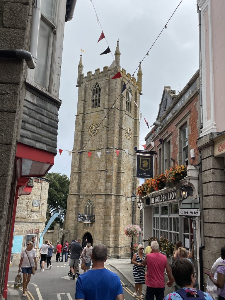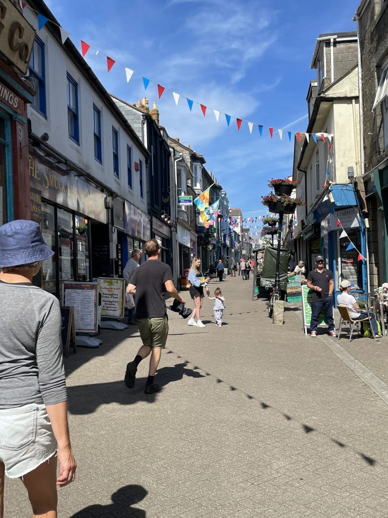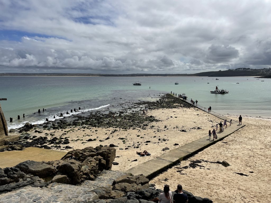 Am nächsten Tag wollen wir nach Penzance fahren. Wir nehmen wieder den Bus. Penzance liegt auch am Wasser, ist aber ganz anders als St. Ives. Man hat das Gefühl, die Stadt hatte schon mal eine bessere Zeit gesehen. Eigentlich besteht Penzance nur aus “1 Euro” und Second Hand Läden. Hier gibt es auch Ladenleerstand und einige Ecken, in denen ich froh bin, Petra dabei zu haben. Also fahren wir kurzentschlossen ein bisschen weiter nach Mousehole, ein kleines Örtchen an der Küste. Das war eine gute Idee. Hier gibt es kleine nette Geschäfte und Galerien, in denen man den Künstlern bei der Arbeit zusehen kann. Am winzigen Hafen essen wir eine Kugel Eis und schauen den Menschen und vor allen den Möwen bei ihrer Futtersuche zu. Unglaublich! Eine Möwe umrundet zu Fuß einen verlassenen Platz mit einer Decke und Strandstühlen. An einem Stuhl hängt eine Tasche. Das ist ihr Ziel! Sie macht sich daran zu schaffen und zieht eine Papiertüte heraus. Es macht einige Arbeit, aber dann hat sie die Tüte auf. Nun kommen ihre Kollegen neugierig dazu. Aber unsere Möwe lässt sie nicht näher kommen, denn sie hat einen dicken Pastie ausgewickelt und fliegt, mit dem schweren Teil im Schnabel, vorn übergekippt, davon. Das war ein lustiges Schauspiel, vor allem weil kurze Zeit später ein ziemlich stabiler Mann aus dem Wasser kam und ziemlich verdutzt auf die leere Papiertüte schaute. Sofort kontrollierte er seine Strandtasche, aber Glück gehabt, außer dem Essen fehlte nichts.
