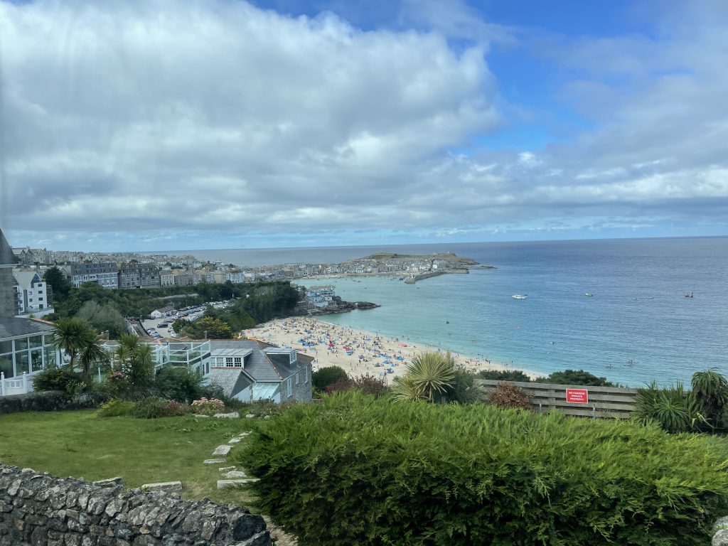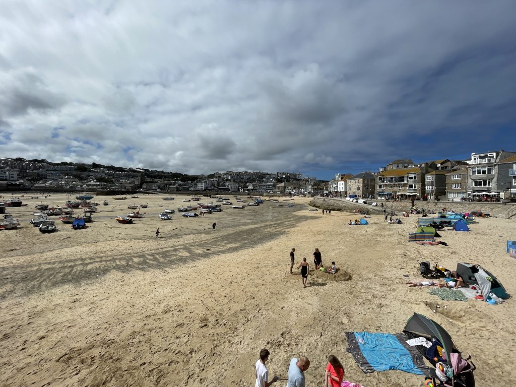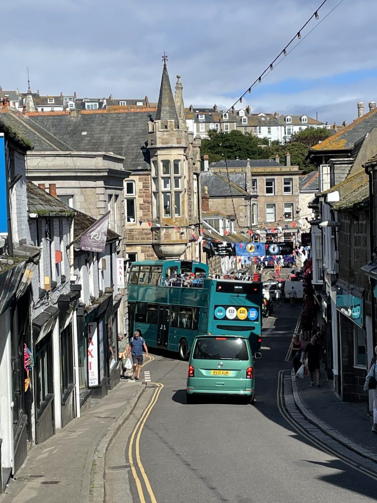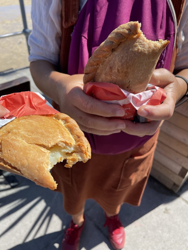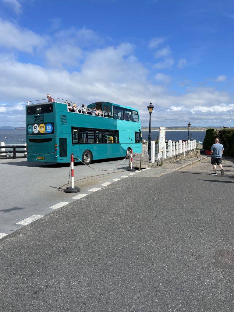 Am nächsten Tag fahren wir mit dem Land`s End Coaster, ein doppelstöckiger, oben offener Bus nach St. Ives und dieser Ort ist wirklich sehr schön. Malerisch am Wasser gelegen, mit engen Gassen und vielen netten Häuschen. Heute trauen wir uns zum ersten Mal an ein Lieblingsgericht der Engländer hier in Cornwall. Pasties! Wir finden beide, das sie für uns nicht so ganz lecker riechen, aber wir sehen täglich Hunderte die sie essen. Also ran! Oh man! Wir kauen beide mit langen Zähnen. Etwa eine Stunde später muss Petra ständig ein “Bäuerchen” machen und ich habe etwas Bauchweh. Die Pastie’s waren einfach zu fett. Im Wohnmobil angekommen, nehmen wir beide ne Omep, dann gehts wieder. Für uns beide bleibt es bei dieser einen Kostprobe, mit Pasties sind wir durch!