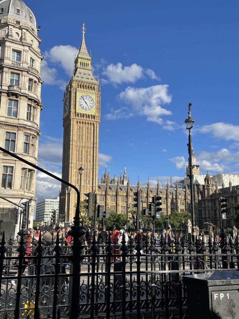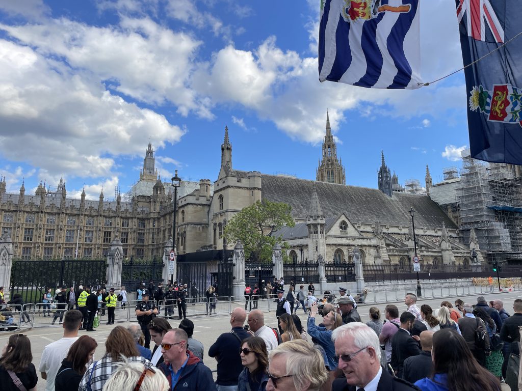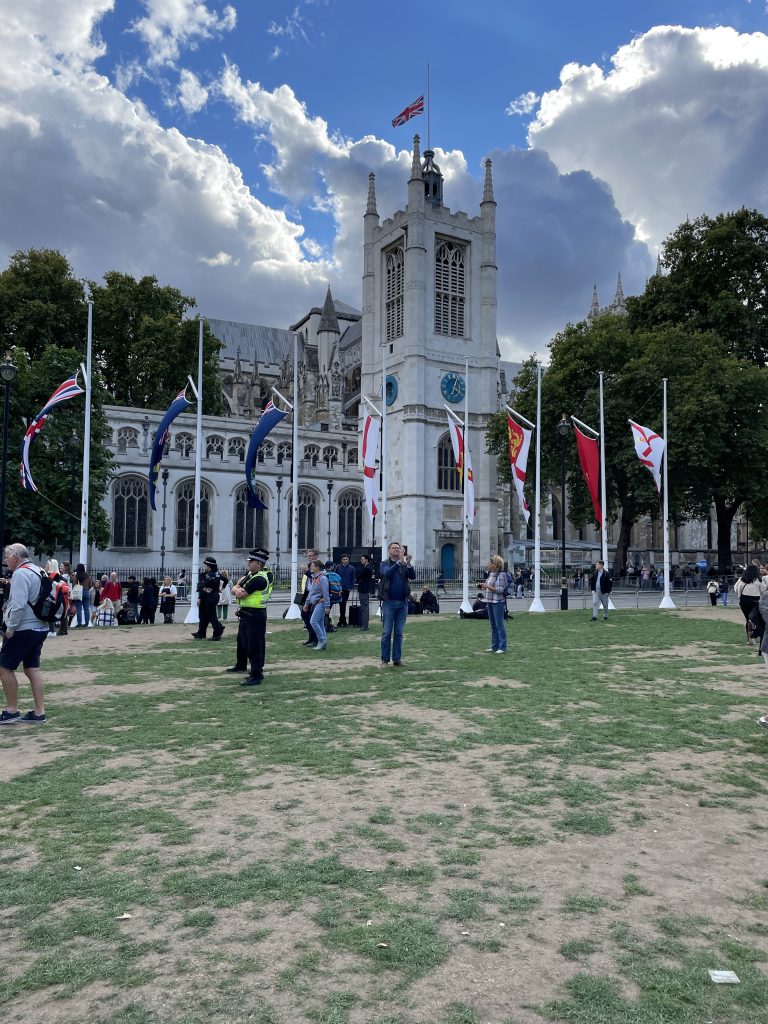 Unser erstes Ziel ist Westminster. Hier liegt Königin Elizabeth II in der Westminster Hall aufgebahrt. Eigentlich wollten wir uns in die “Queue” einreihen – aber die endete ja 6 und mehr Meilen weiter. 12 Stunden anstehen bringen wir dann doch nicht fertig und so sehen wir uns die Westminster Hall nur von außen an. Es reicht auch schon die Stimmung der vielen Menschen, die ebenfalls hierher gekommen sind, aufzufangen. Kloss im Hals all the time.