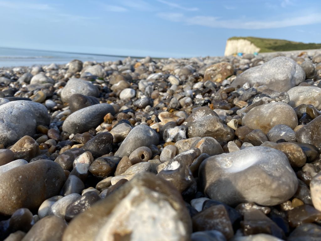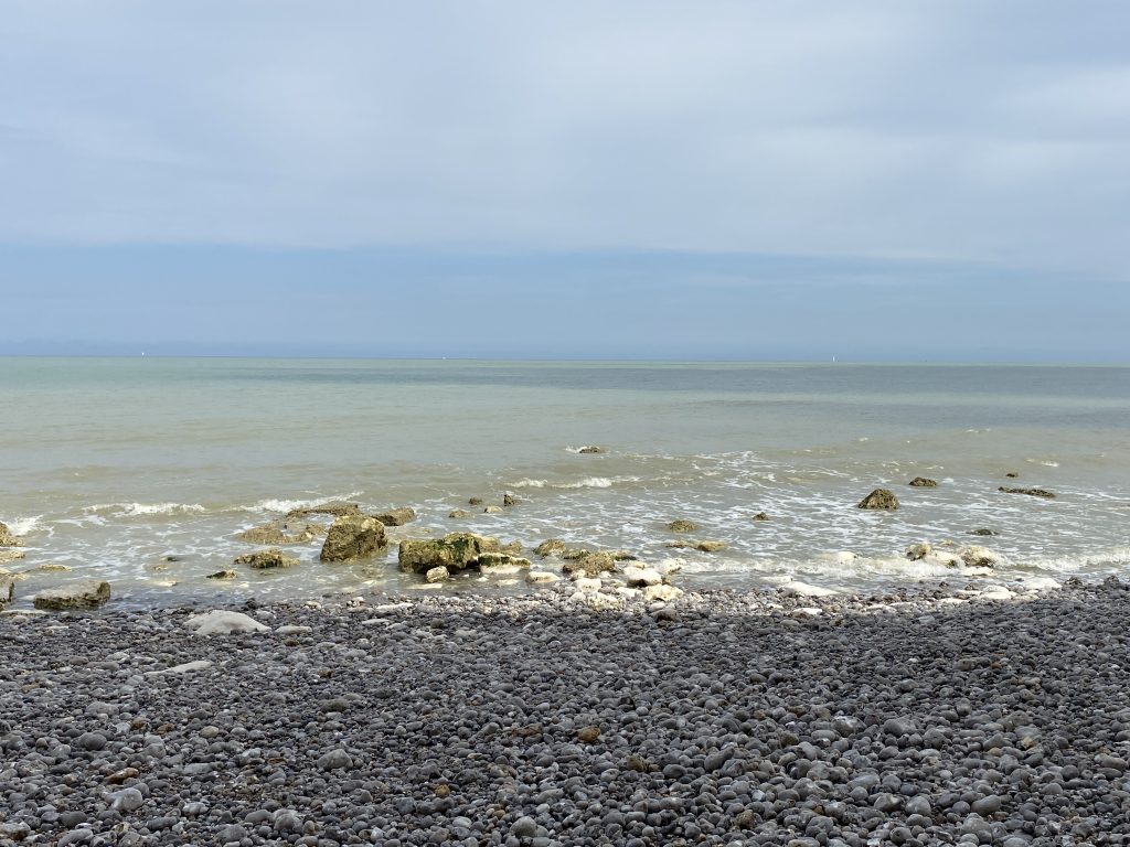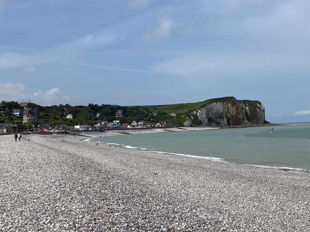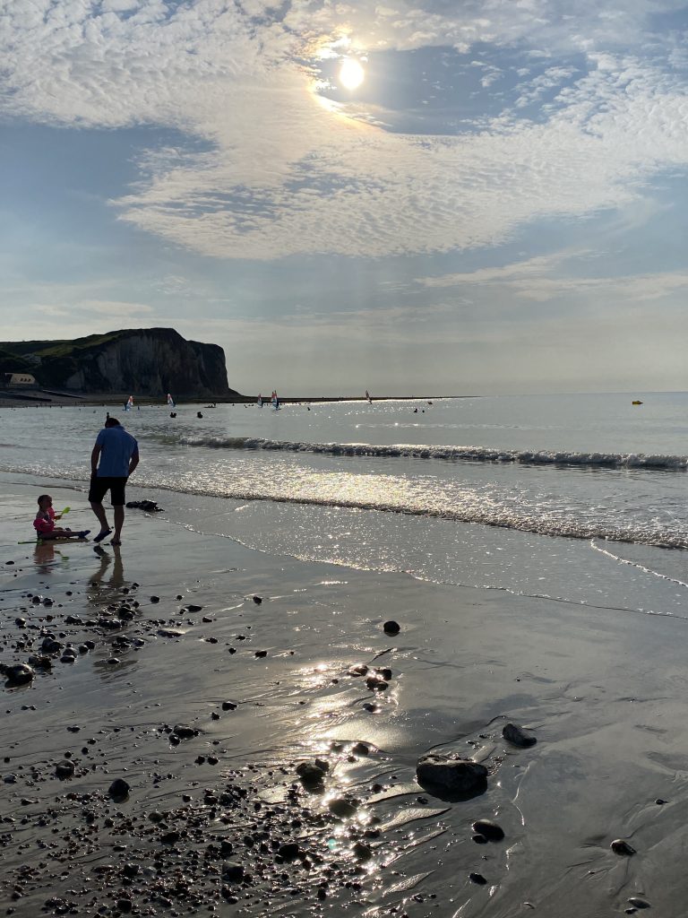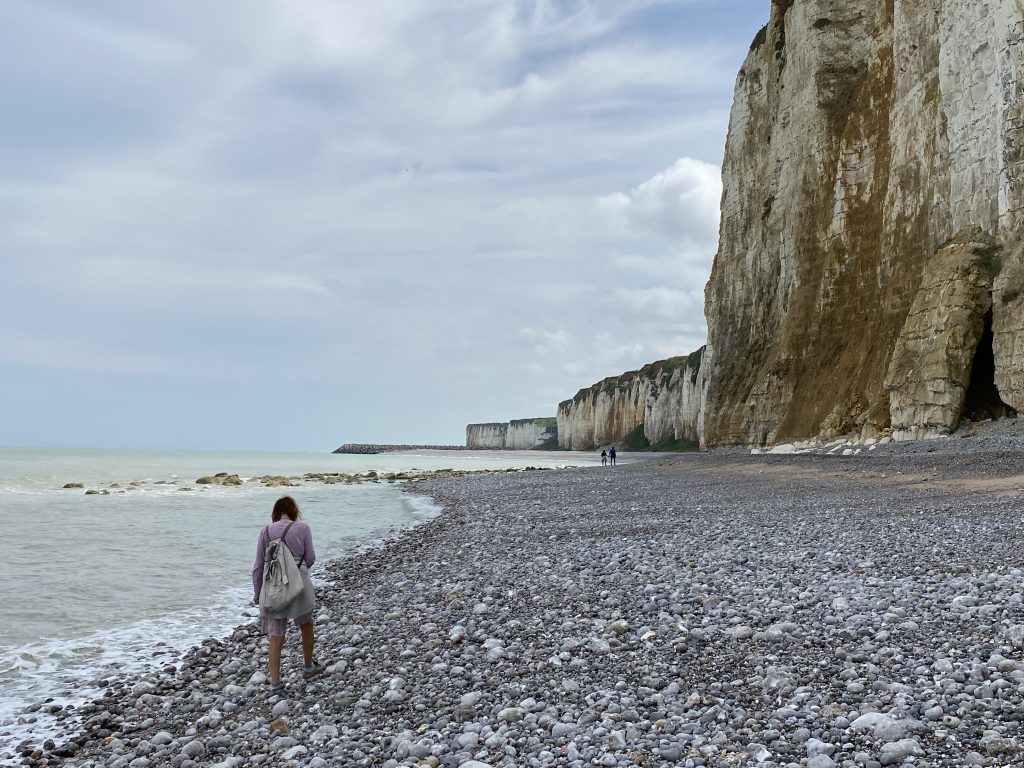 Am nächsten Morgen ein ganz anderes Bild. Hohe Wellen, die die kleinen Kiesel in Bewegung bringen und zu dem Rauschen des Meeres das Geräusch der sich bewegenden Kiesel. Das ist so schön! Petra und ich machen nach dem Frühstück eine ausgedehnte Strandwanderung. Wir müssen eher zurück als gedacht, weil die Flut uns sonst den Weg abschneiden würde. Ich finde soviel Strandgut, Fossilien, angeschwemmtes Holz, leider auch sehr viel Müll. Petra ermahnt mich nicht Zuviel zu sammeln, denn unsere Reise entlang des Atlantik fängt ja gerade erst an. Am frühen Nachmittag sind wir wieder an unserem Wohnmobil und essen eine Kleinigkeit. Ich besorge aus dem kleinen Laden,den es hier gibt ein paar Lebensmittel und den Rückweg gehts wieder am Meer entlang zurück. Petra kocht, wie jeden Abend, was Leckeres und dann gehts nochmal ans Wasser. Sonnenuntergang am Meer 🌊. Am nächsten Morgen gehts dann weiter nach Honfleur.