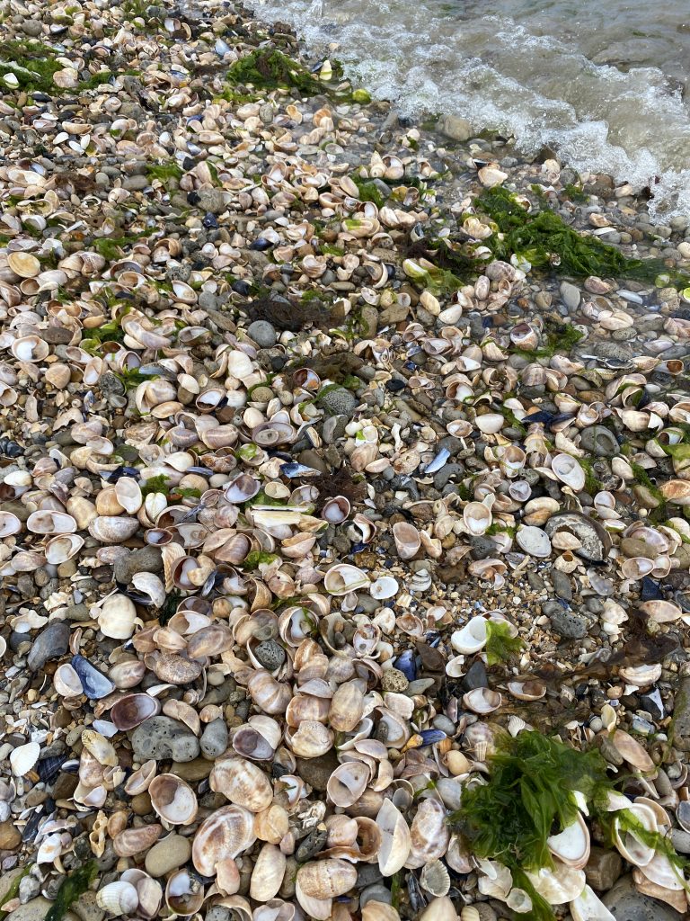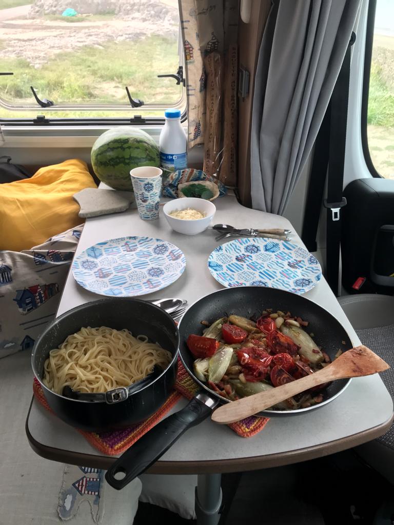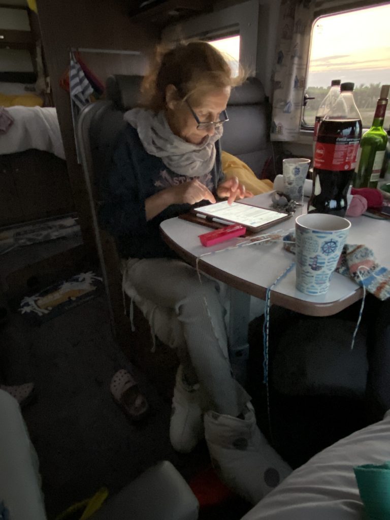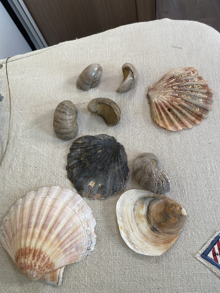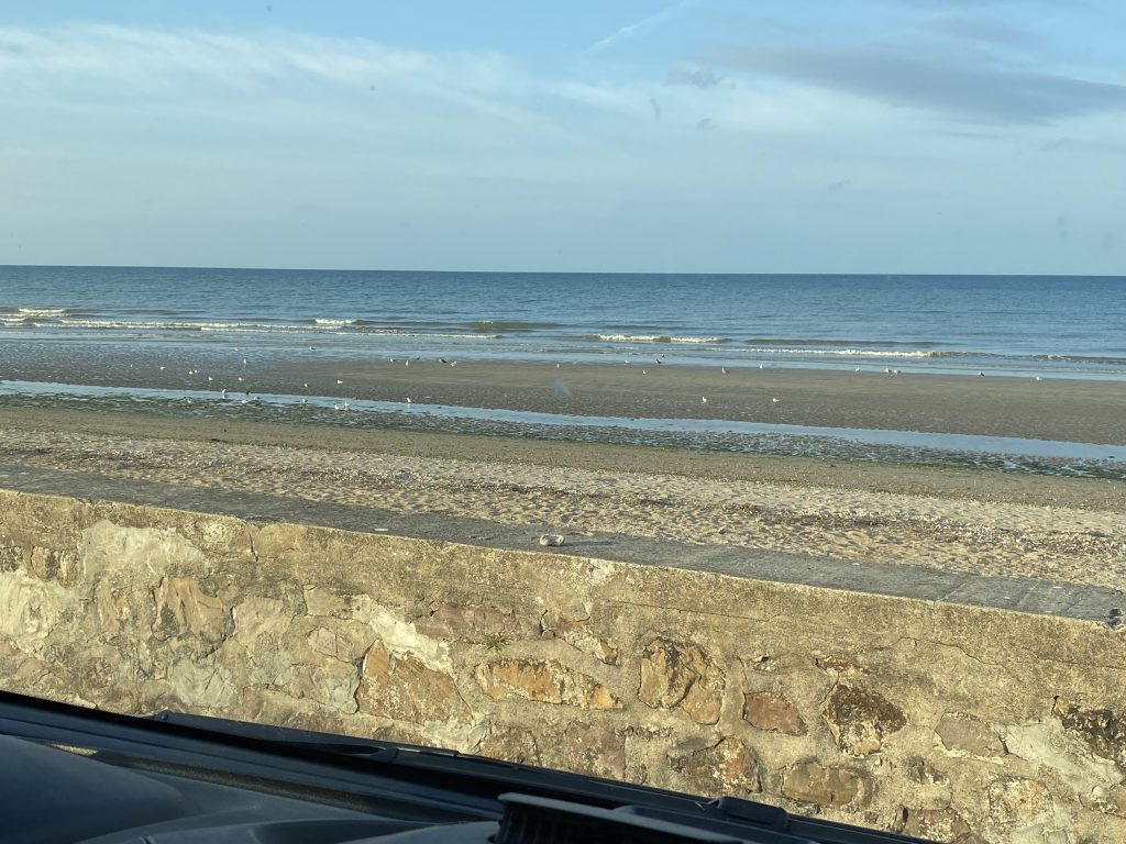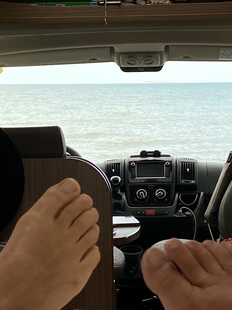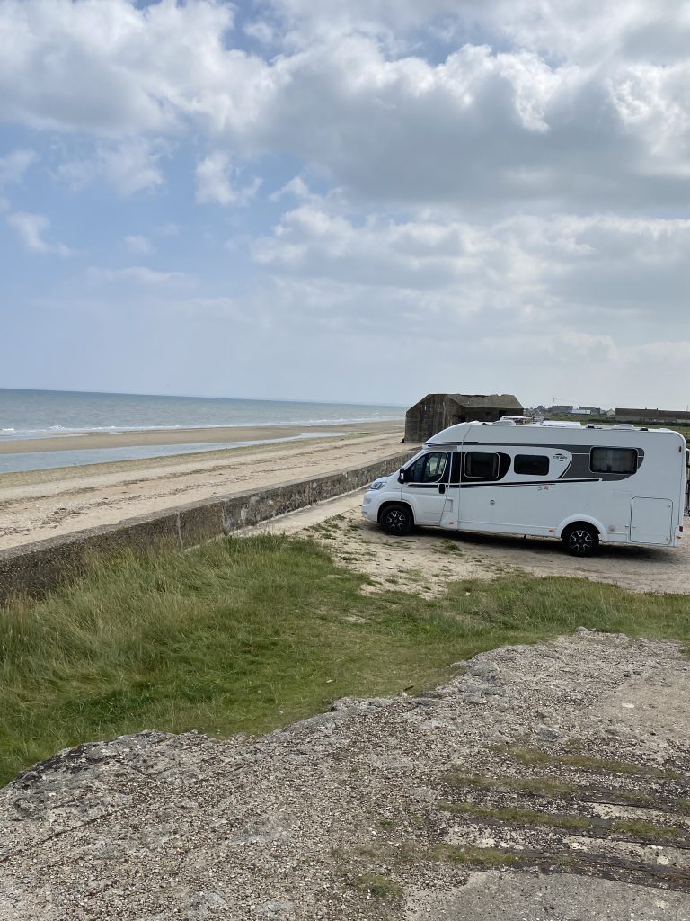 Heute Mittag haben wir einen wunderschönen Strand gefunden und wir stehen mit dem Auto direkt am Wasser. Das Ganze noch dazu kostenlos! Ich musste erstmal sofort ans Wasser. Das Wetter ist gut, aber zum Baden ist es zu kalt. Also erstmal den Drachen zusammen gebaut und steigen lassen. Nach dem Kaffee habe ich einen langen Strandspaziergang gemacht. Petra brauchte Ruhe. Sie hat Musik gehört und mir am Strand zugesehen. Hier gibt es wunderschöne Muscheln und bei Ebbe habe ich auch noch einige Fossilien gefunden. Es ist so schön hier und kaum Menschen am Strand. Was will man mehr. Petra hat wieder leckeres Abendessen gemacht. Danach musste ich nochmal raus — immer mit den Füßen im Wasser— am Strand entlang. Das ist ein glücklicher Tag. Gerade sitzen wir im Womo und genießen den Ausblick zum Wasser und trinken landestypischen Calvados. Den muss ich aber nicht nochmal haben. Er riecht noch ganz lecker, ist aber sehr hochprozentig und brennt im Hals. Ein Gutes hat er aber, er macht mich wieder warm von den langen Strandspaziergängen. Bin gespannt, was uns der Morgen bringt. Wir wollen wieder mit den Rädern los.