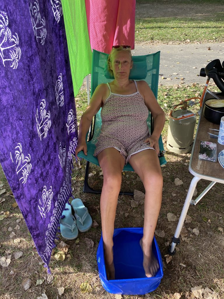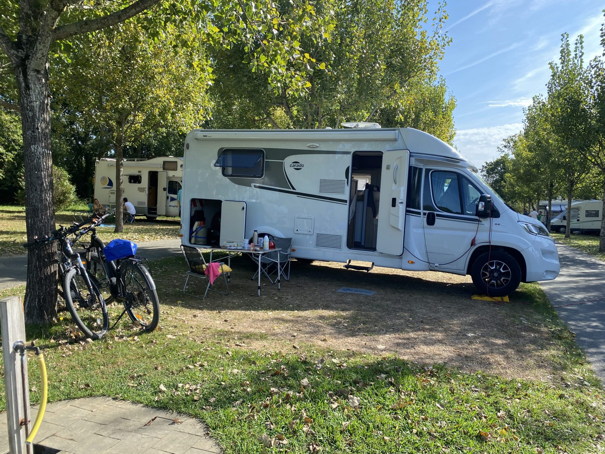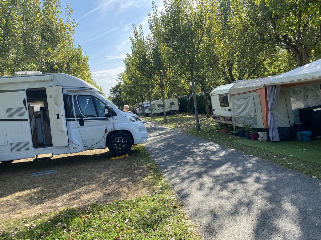 So ein Glück! Nach vielen asphaltierten Übernachtungsplätzen, (die natürlich recht günstig sind) haben wir heute Abend einen 4 Sterne Campingplatz gefunden, der noch dazu nicht besonders teuer ist. Wir können hier unsere Wäsche waschen, duschen und unseren Wassertank auffüllen bzw. unser Abwasser entleeren. Noch dazu können wir hier auf einer Wiese unter Bäumen stehen. Wie schön! Es gibt einen Pool ein kleines Restaurant und morgens hole ich keine Brötchen, aber frisches Baguette zum Frühstück. Wir bleiben hier 4 Tage und warten ein bisschen darauf, dass es sich etwas abkühlt. Denn es ist immer noch unerträglich heiss. Leider klettert das Thermometer auch nachts nicht unter 30 Grad bzw. hatten wir nachts 2x 30 grad warme Orkanböen. Das hat man so auch noch nicht erlebt.