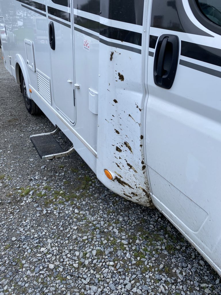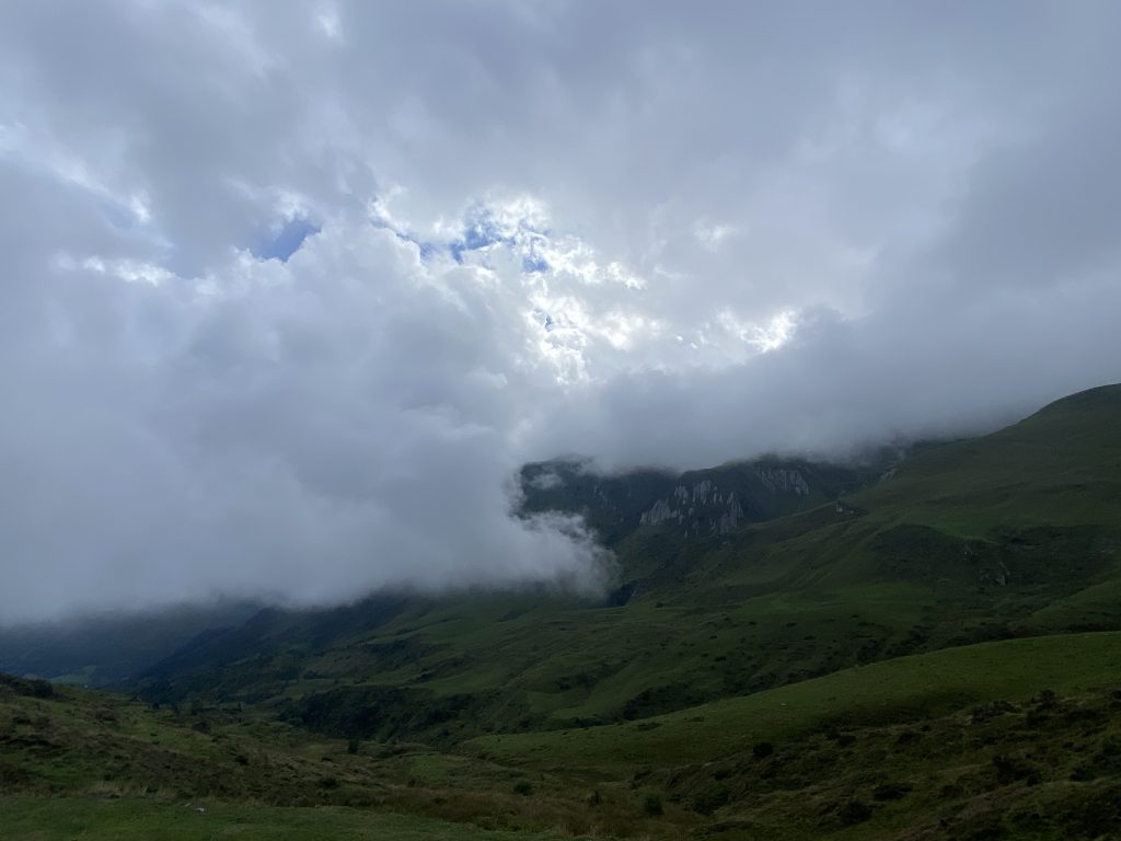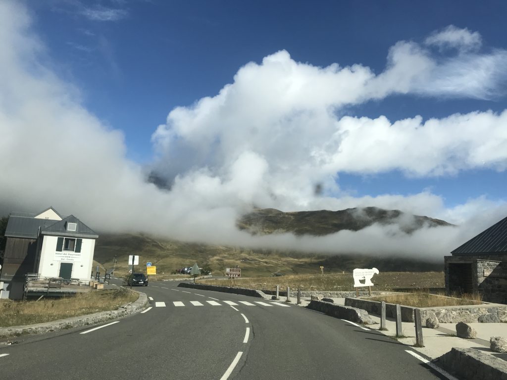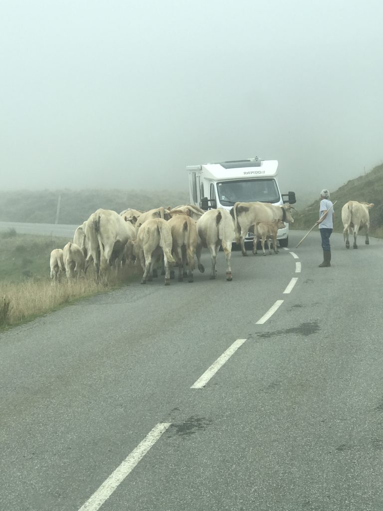 Nach dem Frühstück machten wir uns wieder auf den Weg, Gavarnie soll ja ganz schön sein. Wie gut das wir vorher nicht wußten, was wirklich auf uns zukommt. Die Straßen wurden immer sepentiniger, immer steiler, immer schmaler und dann ab 1500 Meter Höhe auch gänzlich ohne Geländer. Manchmal konnte man in den gigantisch tiefen Abgrund sehen, manchmal aber auch gar nichts, weil wir durch Wolken gefahren sind. Ich wußte nicht was schlimmer ist. Sehen wo man wirklich langfährt oder den Nebel. In 1700 Metern Höhe gab es dann auch zusätzlich Kühe, Ponys, Motorradfahrer, Rennradfahrer und Wohnmobile auf der Straße. Heide saß kreidebleich im ihrem Sitz festgekrallt und ich dachte “jetzt bloss nicht die Nerven verlieren, was die Fahrer der Tour de France schaffen, schaffen wir ja wohl mit einem Wohnmobil?” Mir wurde selbst auch so flau im Bauch, dass ich daran dachte umzukehren. Aber Wendemöglichkeiten gab es keine. Also AUGEN AUF und durch! Rechts am Straßenrand ist fast überall in den französischen Bergen ein Miniabgrund, damit das Wasser von den Bergen ablaufen kann. Eine falsche Bewegung oder Ausweichmannöver, weil mal wieder nicht 2 Autos nebeneinander passen und man fährt mit einem Reifen in den Miniabgrund. Das wär es dann – Reise beendet – und kapitaler Schaden am Fahrzeug. Also lieber anhalten, wenn man denkt es passt nicht und vorsichtig aneinander vorbeibuchsieren. Auf der Strecke haben wir dann auch tatsächlich einen Van gesehen, der mit dem Hinterrad im Miniabgrund stecke. Abschleppwagen stand auch schon da. Er tat mir echt leid.