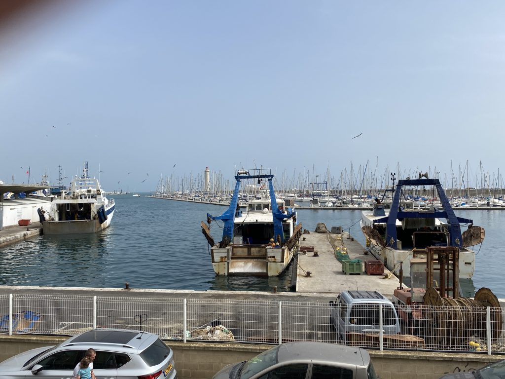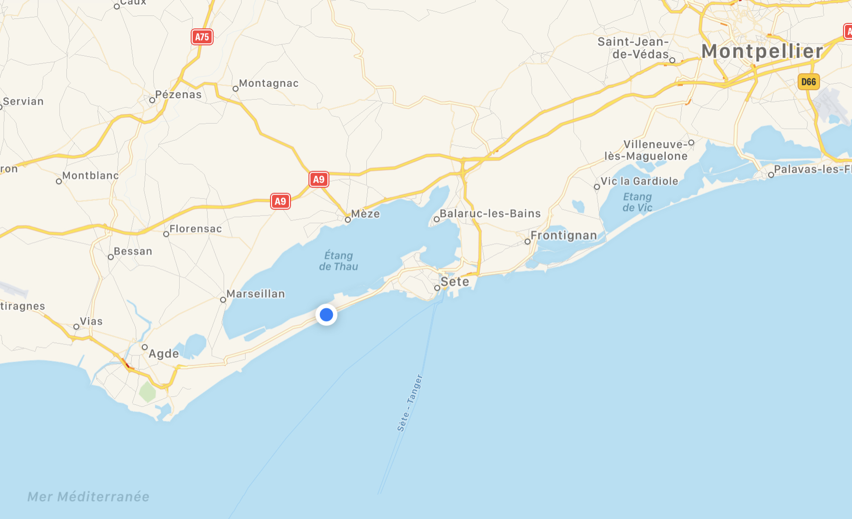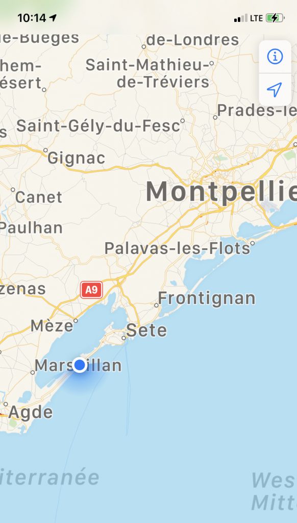 Einige Kilometer vor der Stadt Sète sahen wir mehr zufällig einen Wohnmobilstellplatz zwischen dem Mittelmeer und unserer Straße. Einige Camper standen schon dort und wir überlegten, ob wir uns dazu stellen sollten. Im nächsten Kreisverkehr (es gibt hier Millionen davon, habe ich sicher schon erwähnt) sahen wir dann das erste Mal das Mittelmeer so richtig. Toller Strand— hohe Wellen, uns war sofort klar, hier wollen wir bleiben. Also zweimal gekreist und ab auf den Stellplatz.