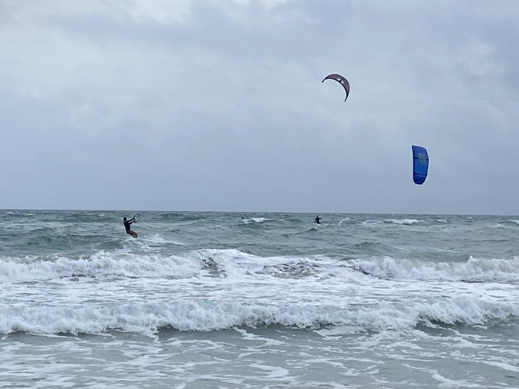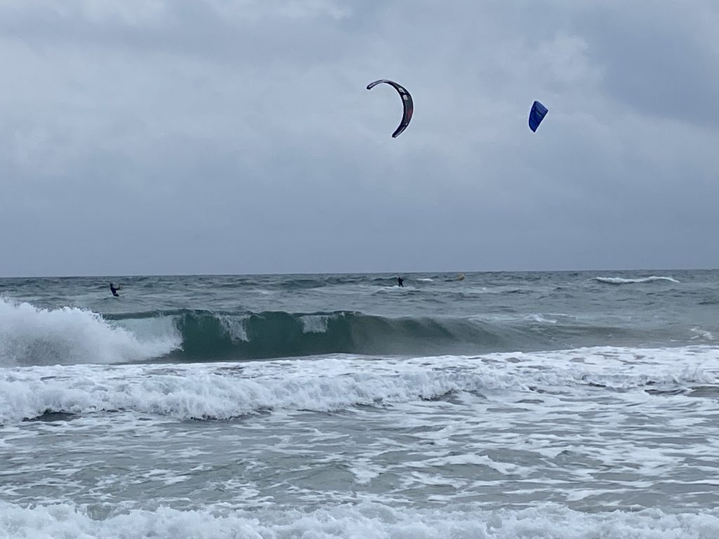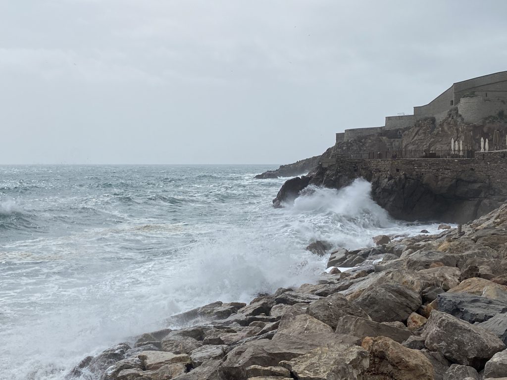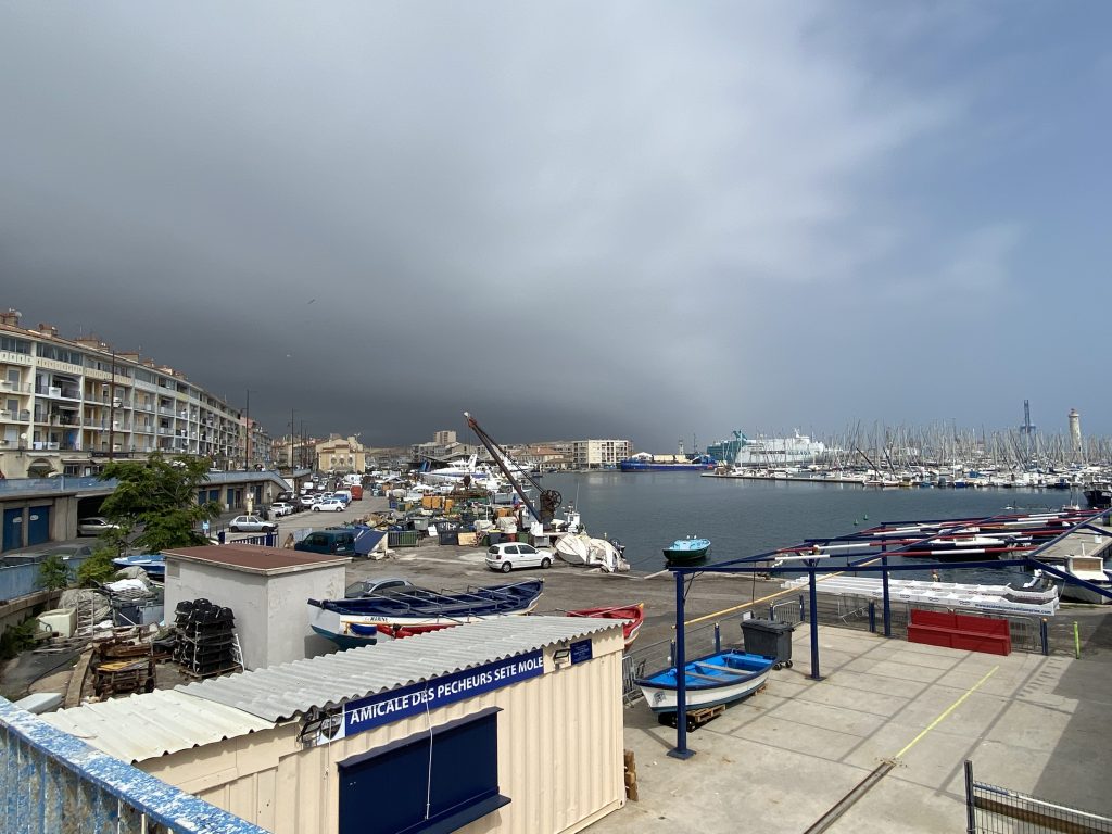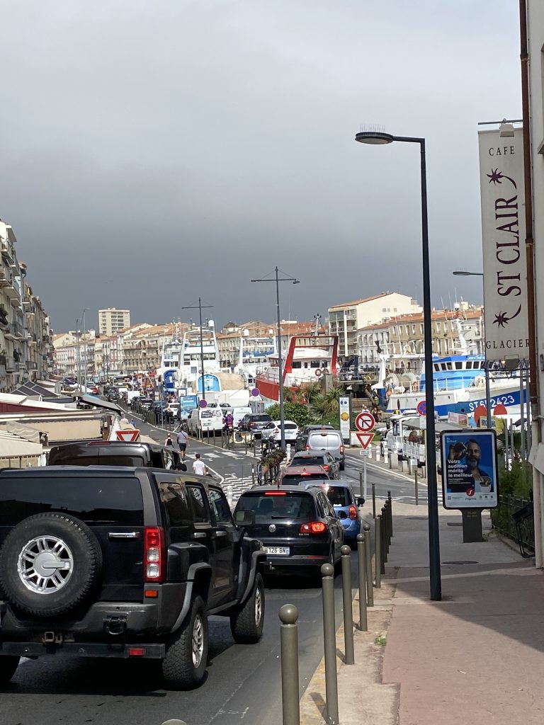 Am nächsten Tag erradelten wir uns dann die Stadt Sète. Auch hier war es sehr schön, viele alte Bauten, leider auch viel Leerstand und Verfall, ein riesiger Hafen und nette kleine Geschäfte.……….es war kochend heiss schwül… , so dass wir nach einem Eis wieder zu „unserem“ Strand radelten und ins Meer sprangen. Bei bis zu 2 Meter hohen Wellen ein riesen Spaß. Besonders gefallen hat uns auch, das kaum Menschen am Wasser waren. Somit war es fast wirklich unser Strand. Es ist ein tolles Gefühl, wenn man das Meer fast für sich alleine hat. Petra machte mich auf die sehr bedenkliche Wolkenformation (mindestens Gewitter oder noch schlimmer) aufmerksam und sie sollte Recht behalten.